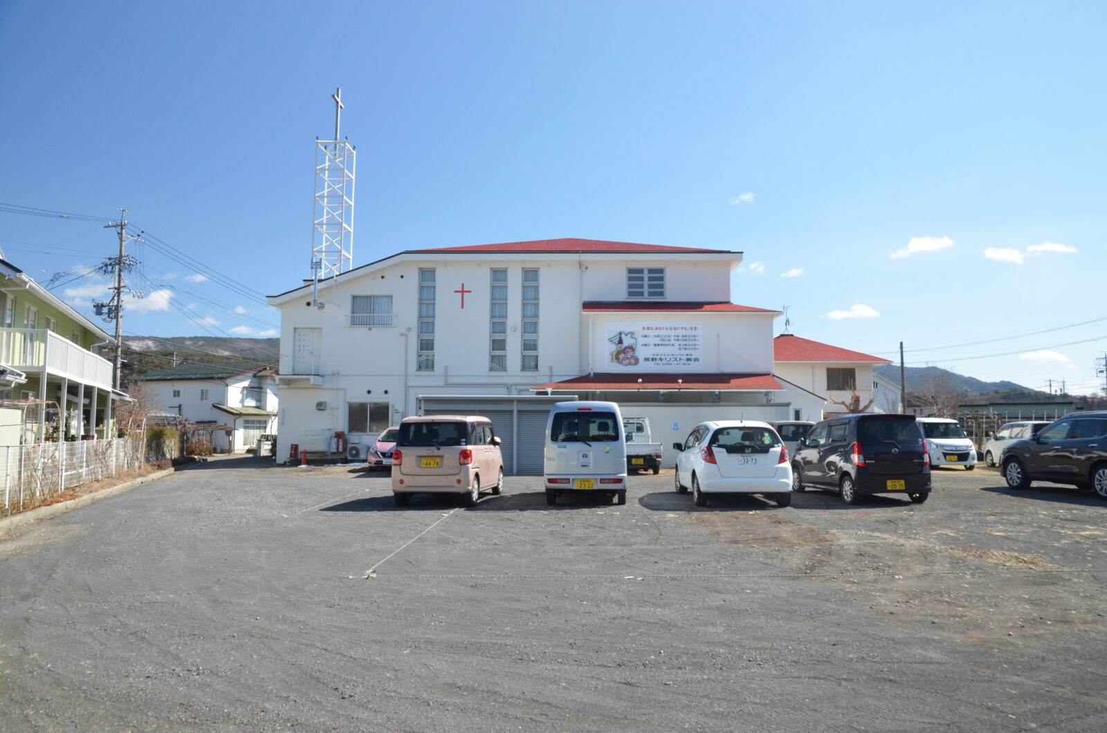 当教会には、約30台分の駐車スペースがあります。礼拝や集会の際には、駐車場を自由にご利用いただけます。お車でお越しの際は、どうぞご利用ください。