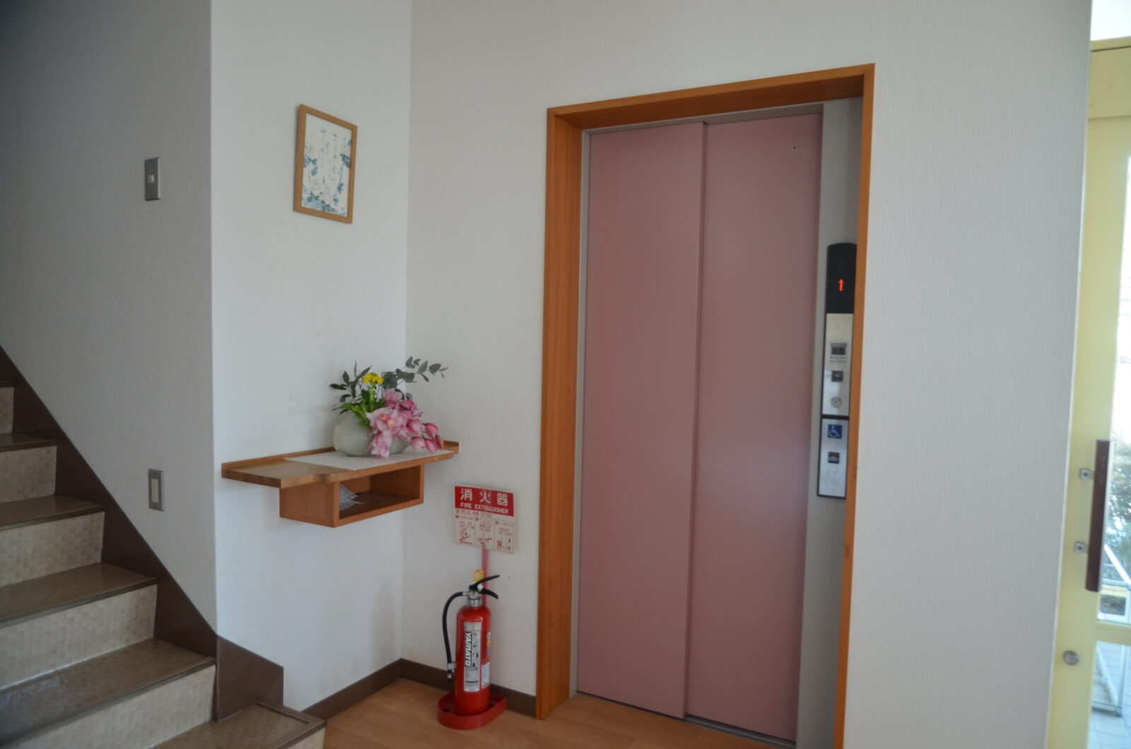 玄関には、車いすで直接入れるスロープが設置されています。2階が礼拝堂になりますが、エレベーターも完備されています。どなたでもご利用いただけますので、ぜひご活用ください。