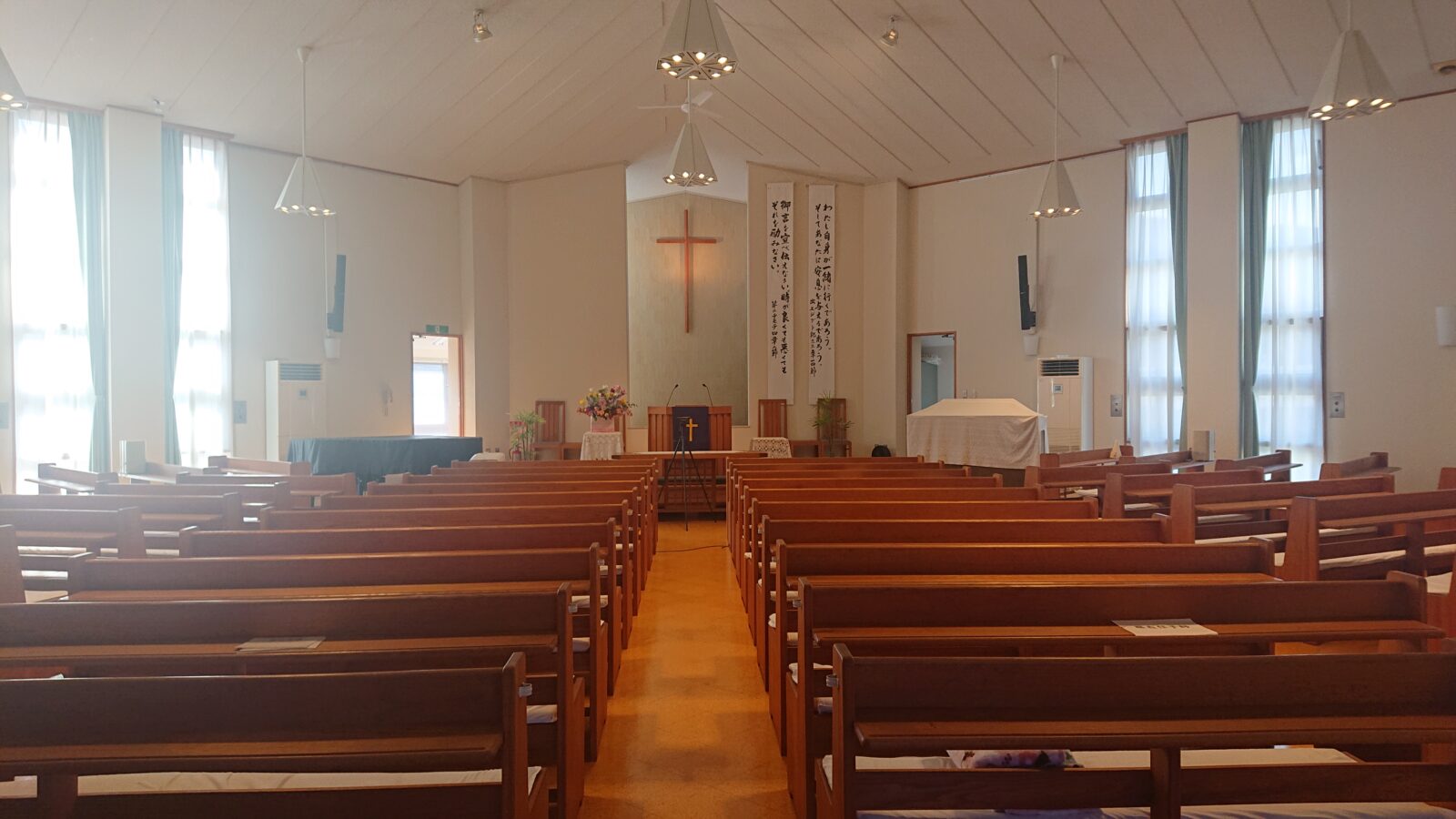 礼拝堂は、神様を礼拝するための大切な場所です。ここで神様と向き合い、祈りや賛美を捧げるひとときをともに過ごしましょう。耳の遠い方には、イヤホンでマイクの音を聞ける席もご用意していますので、どなたでも安心して礼拝に参加していただけます。
